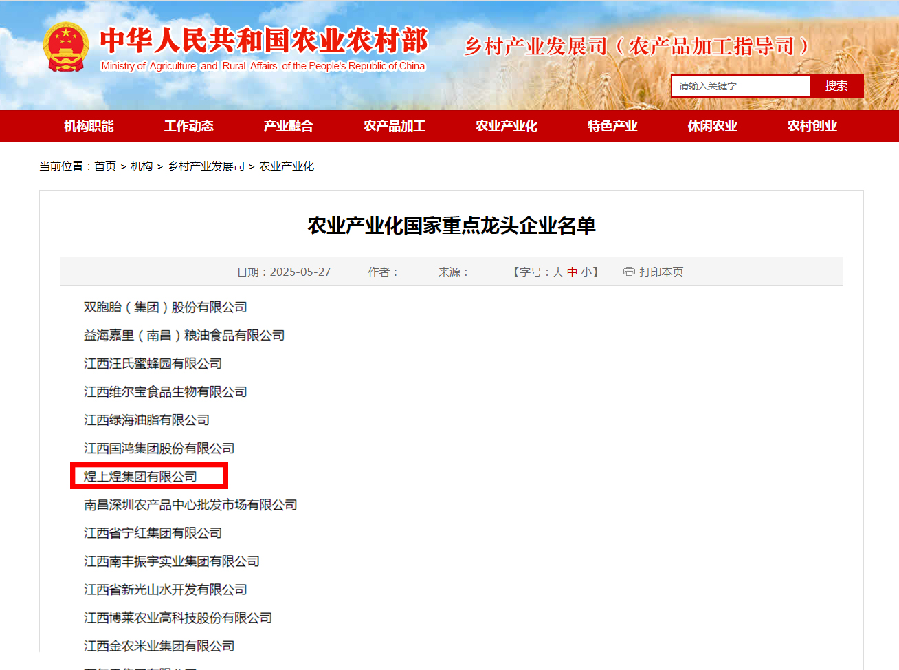 近日,農(nóng)業(yè)農(nóng)村部公布農(nóng)業(yè)產(chǎn)業(yè)化國家重點龍頭企業(yè)最新名單。其中,煌上煌集團有限公司再次獲評“農(nóng)業(yè)產(chǎn)業(yè)化國家重點龍頭企業(yè)”,這是煌上煌...